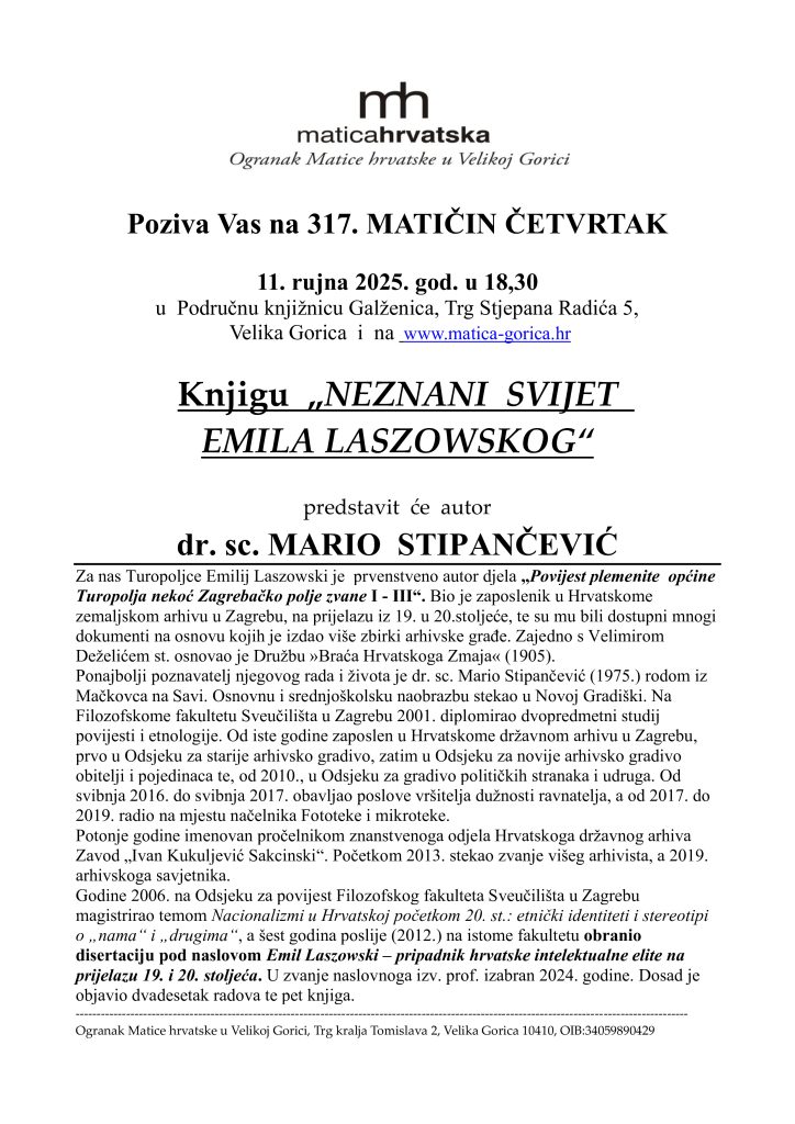 Ogranak Matice hrvatske Velika Gorica poziva Vas na 317. Matičin četvrtak 11. rujna 2025. god. u 18,30 u Područnu knjižnicu Galženica, Trg Stjepana Radića 5 Velika Gorica i na www.matica-gorica.hr
