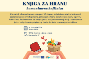 Na Središnjem odjelu održana akcija “Knjiga za hranu”16. listopada 2024.Pročitaj višeKNJIGA ZA HRANU: humanitarna knjižnica8. listopada 2024.Pročitaj višeBožićna donacija djelatnika Gradske knjižnice udruzi VG Legacy i njihovom projektu socijalnoj trgovini Robin Food21. prosinca 2022.Pročitaj više